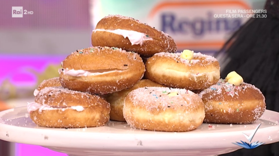 - Impasto: 550 g farina manitoba, 100 g zucchero, 100 ml acqua, 100 g burro, 25 g lievito di birra, 5 tuorli, 3 albumi, olio per friggere, codette di zucchero colorate
