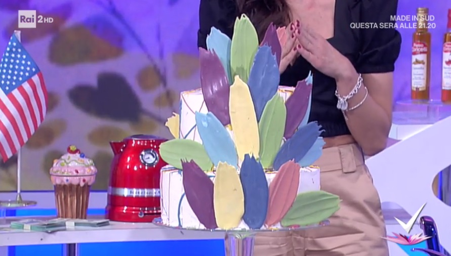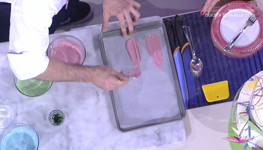 Prendiamo i pan di Spagna freddi e ne accoppiamo due con abbondante crema al burro. Spatoliamo la crema anche esternamente, in modo da rendere la torta liscia e bianca. Impiliamo le torte, se vogliamo ottenere una torta alta, usando pioli e dischi di cartone. Se invece facciamo solo un piano, coliamo un po’ di cioccolato bianco colorato sulla torta, in maniera casuale, in modo da striarla. Attacchiamo, infine, le lingue di cioccolato alla torta.