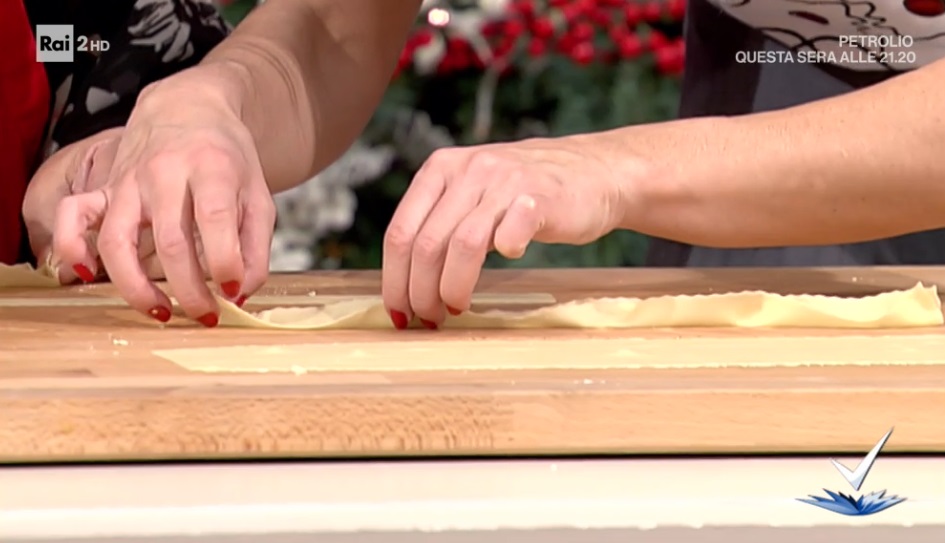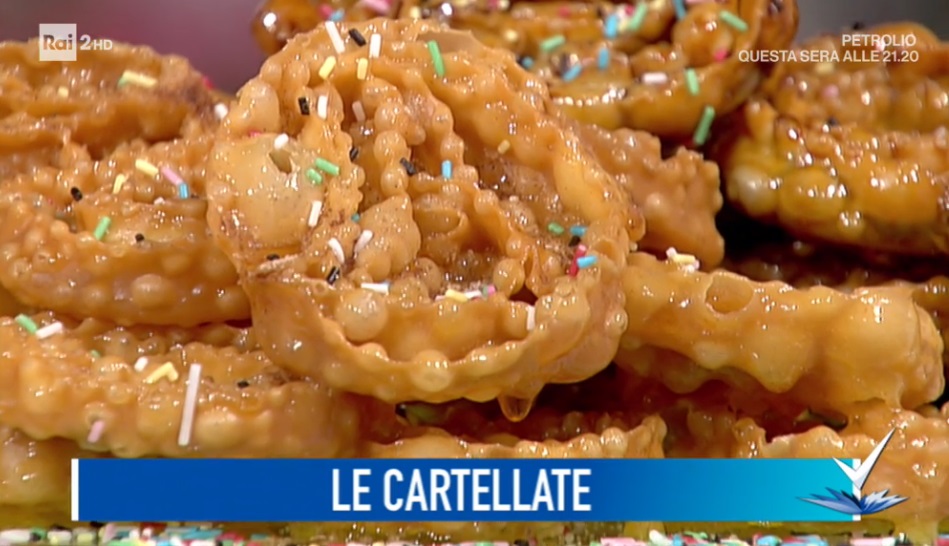 cartellate di GiustinaLa tutor e nonna all’avanguardia Giustina Dibello protagonista dello spazio dedicato alla cucina, all’interno del programma condotto da Bianca Guaccero su Rai2, Detto Fatto, ha proposto uno dei suoi dolci casalinghi: le cartellate. Di seguito ingredienti e procedimento.