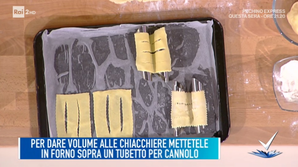 Stendiamo l’impasto con una sfogliatrice per pasta all’uovo (la nonna papera). Dobbiamo ottenere una sfoglia sottile. Luca consiglia di piegare la sfoglia su se stessa due o tre volte quando la stendiamo con la macchinetta. Ricaviamo le chiacchiere con una rotella seghettata. Pratichiamo delle incisioni sulle chiacchiere e le disponiamo su una teglia con carta forno. Per dare movimento, possiamo appoggiarle su canne per cannoli imburrate. Cuociamo in forno caldo e statico a 180° per 10 minuti.