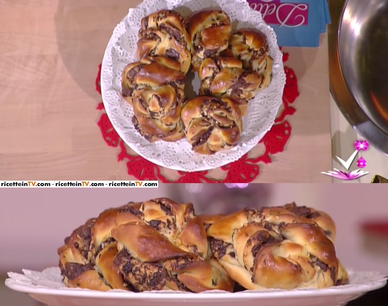 Pratichiamo al centro di ogni rettangolini un nuovo tagliamo verticale, lasciando 2 cm dal bordo. Arrotoliamo le due strisce ottenute su se stesse, ad elica. Annodiamo un’elica sulla parte di unione e la seconda la facciamo passare sopra la girella. Disponiamo su una teglia foderata di carta e lasciamo lievitare ancora mezz’ora. Spennelliamo con l’uovo sbattuto ed inforniamo a 180° per 15 minuti. Facciamo lo stesso con l’altra metà dell’impasto.