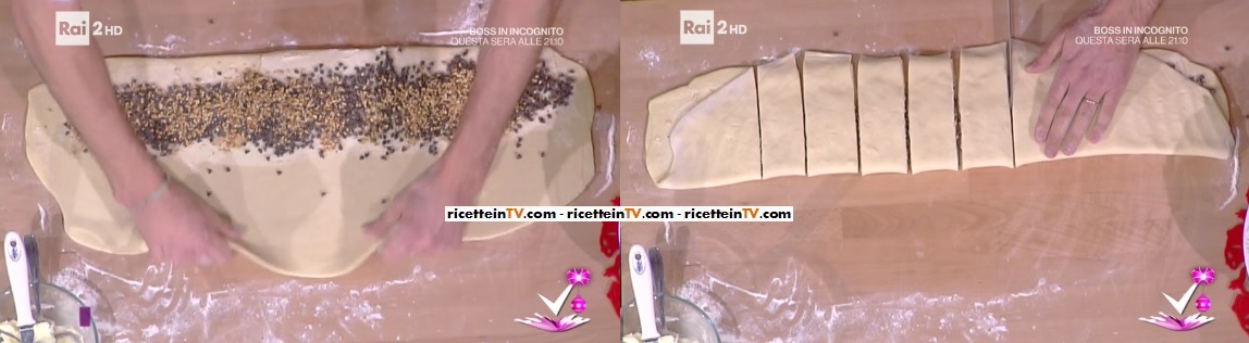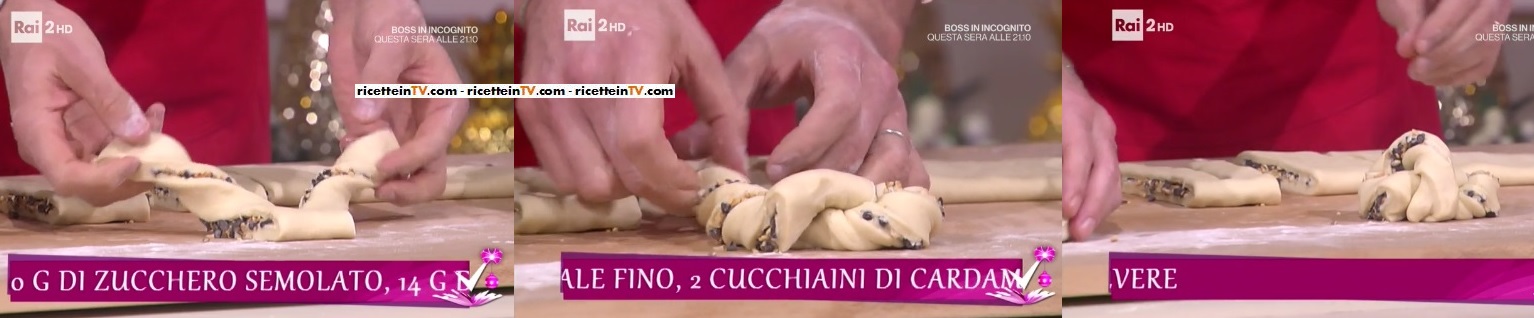Per l’impasto: sciogliamo il burro ed uniamo il latte. Aggiungiamo il lievito disidratato e mescoliamo bene. A parte, in una ciotola capiente, misceliamo la farina, il sale, lo zucchero ed il cardamomo. Uniamo la miscela di latte e burro (con il lievito) ed impastiamo il tutto, fino ad ottenere un composto elastico e soffice. Diamo la forma di una palla. Mettiamo in una ciotola, copriamo con la pellicola e lasciamo lievitare, al caldo ed al buio, per 1 ora circa. Dividiamo l’impasto lievitato a metà. Ne stendiamo metà col matterello fino ad ottenere un rettangolo spesso circa mezzo cm.