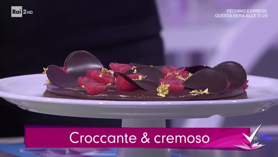 Cremoso: portiamo a bollore il latte. A parte, mescoliamo lo zucchero con l’amido di riso, quindi aggiungiamo i tuorli. Stemperiamo col latte caldo, mescoliamo e rimettiamo sul fuoco. Mescolando, dobbiamo arrivare a 82° (deve addensarsi). Spegniamo il fuoco ed uniamo il cioccolato fondente tritato. Mescoliamo fino a scioglierlo completamente. Copriamo con la pellicola a contatto e lasciamo in frigorifero 3-4 ore. Trasferiamo in una sacca da pasticciere e formiamo uno strato sulla base croccante. Lasciamo rapprendere in frigorifero e, prima di servire, decoriamo con lamponi o altra frutta fresca.