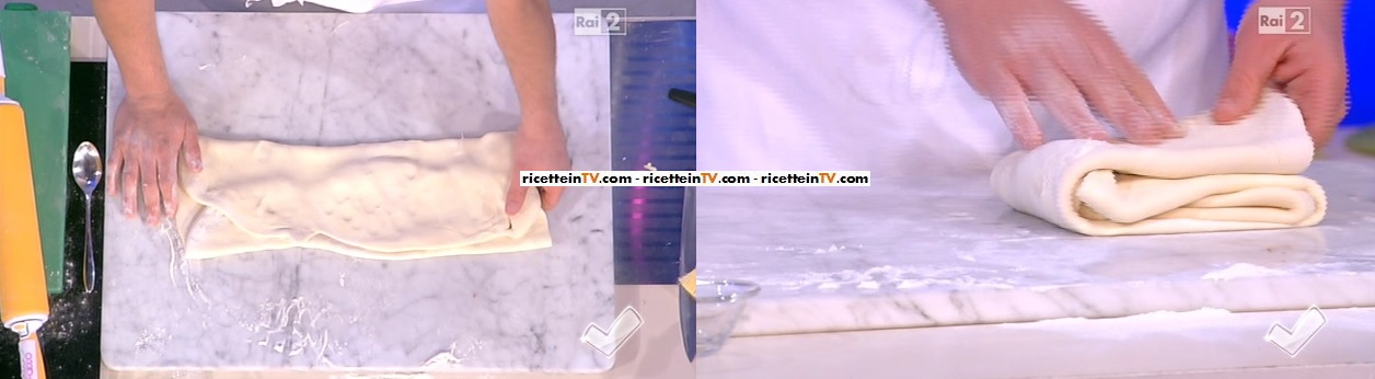 Per l’impasto: miscelare acqua, farina e sale in una ciotola, fino a rendere l’impasto omogeneo. Far riposare in frigo l’impasto, coperto, per almeno 20 minuti. Prendiamo il pezzo di burro, che non dev’essere troppo freddo, e lo pestiamo tra due fogli di carta forno fino a renderlo di forma rettangolare. Lo lasciamo riposare in frigorifero. Dopo i riposi, che vanno sempre rispettati e mai saltati per una perfetta riuscita del prodotto, stendere l’impasto di acqua e farina dando la forma di un rettangolo poco più grande del rettangolo del burro, in modo da poter assicurare nella seconda fase il piazzamento nel centro dell’impasto del burro. Richiudere prima le linee orizzontali del rettangolo e poi le verticali, stendere con il mattarello. Dopo di che date la prima piega a libro. Chiudete tutto in pellicola e lasciate riposare 45 minuti. Fate la stessa cosa per tre volte: dovrete aspettare 45 minuti tra un passaggio e l’altro. Quando abbiamo finito, stendiamo il rettangolo di sfoglia e formiamo il fagottino con delle forme quadrate di circa 10 cm x 10 cm.
