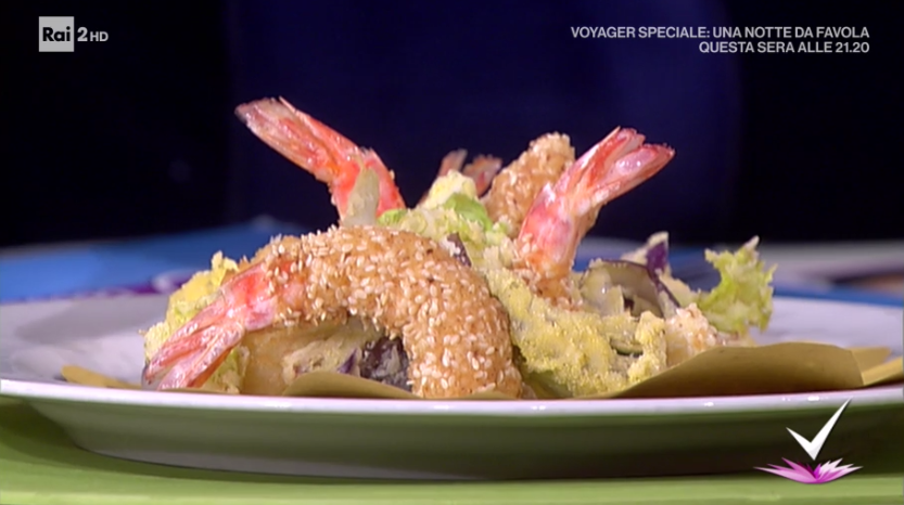 • Gamberi inciminati: 12 gamberi, 50 g farina di ceci, 2 albumi, 80 g pane grattugiato, 20 g sesamo tostato, sale, olio di semi per friggere
