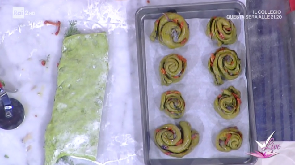 Trasferiamo l’impasto lievitato su un piano infarinato e lo stendiamo all’altezza di mezzo cm, con il mattarello, in modo da ottenere un rettangolo (35×70 cm). Su metà rettangolo distribuiamo i pomodori rinvenuti e tagliati a listarelle. Distribuiamo sopra del finocchietto fresco, la cipolla appassita, la rucola ed un filo d’olio. Copriamo con l’altra metà dell’impasto e facciamo ben aderire. Tagliamo delle strisce larghe 2-3 cm circa. Arrotoliamo e formiamo le girelle, che disponiamo su una teglia con carta forno e facciamo lievitare ancora 15 minuti. Inforniamo a 190° per 30 minuti.
