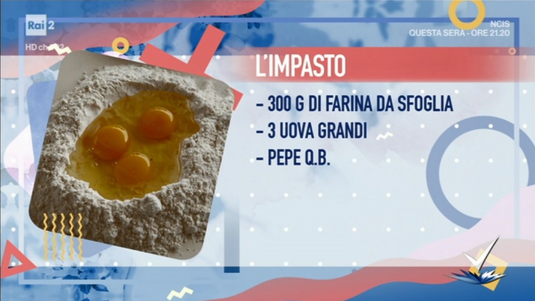 • per l’impasto: 300 g di farina da sfoglia, 3 uova grandi, pepe qb