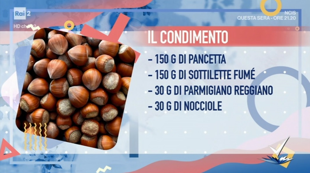 Condimento: frulliamo le nocciole nel mixer. Rosoliamo la pancetta, tagliata a dadini in una padella antiaderente.
