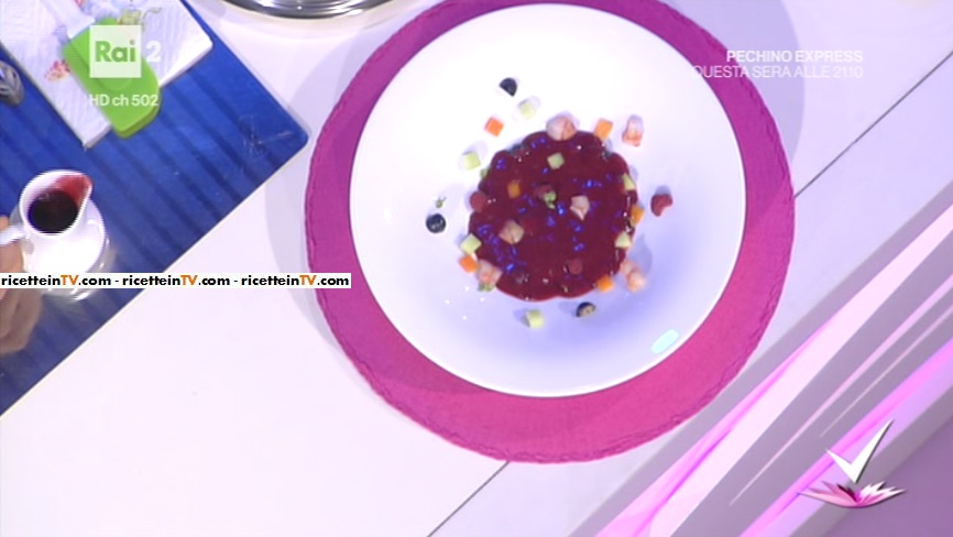 - Per 4 persone: 500 ml acqua, 200 g mirtilli, 150 g polpa di cetriolo, 110 g pomodori ciliegino, 70 g fragole, 70 g lamponi, 4 code di gambero, 50 g pane raffermo, 20 g peperone rosso, 15 g sedano, 15 g aceto di vino bianco, 1/2 cucchiaino di zucchero, sale
