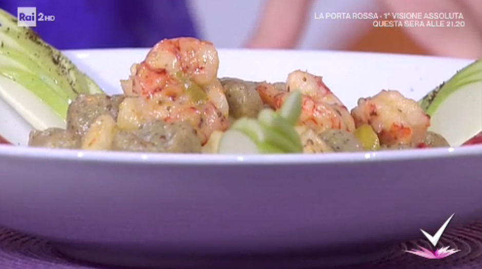 Prepariamo il condimento. Scaldiamo un filo d’olio con lo spicchio d’aglio. Uniamo la mela verde a tocchetti (lasciamo la buccia), le code di gamberi rossi già pulite, la senape e la panna. Lasciamo insaporire qualche minuto, saliamo, pepiamo e il condimento è pronto. Uniamo gli gnocchi, saltiamo e serviamo.