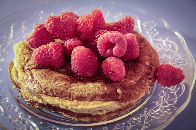 Ingredienti: 125 g di farina integrale, 40 g di zucchero di canna, 1 cucchiaino di vaniglia in polvere, mezzo cucchiaino di lievito per dolci, mezzo cucchiaino di bicarbonato, 200 ml di latte di avena, 60 g di uovo light, 1 cucchiaino di olio di cocco, 1 pizzico di sale, 100 g di lamponi, 4 cucchiai di sciroppo d’acero.