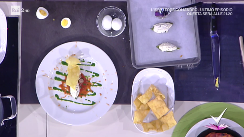 Su un piatto da portata, creiamo una macchia di salsa. Poggiamo sopra una foglia di lasagna fritta, ancora salsa, ricotta, grana grattugiato e qualche polpettina. Finiamo con mozzarella e uova sode a fettine sottili. Copriamo con un altra sfoglia fritta. Decoriamo con il basilico.