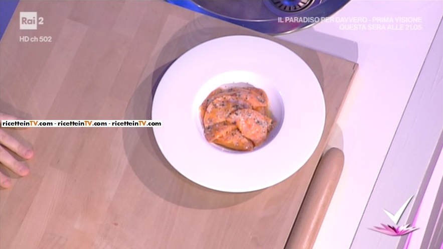 Per la sfoglia rossa: impastiamo la farina con le uova ed il concentrato di pomodoro. Otterremo una sfoglia rossa, che facciamo riposare, coperta, per mezz’ora. La stendiamo sottile e ricaviamo dei dischetti.