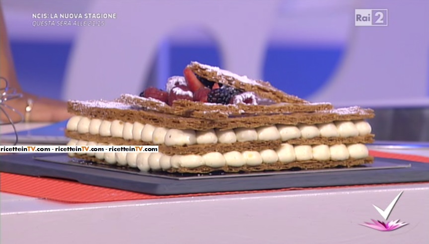 Per la composta: frullare con il mixer lamponi, more e mirtilli quindi filtrare il tutto. In una casseruola, riscaldare la polpa e, quando è tiepida, aggiungere zucchero e pectina mescolati precedentemente insieme e fare bollire 20 secondi. Raffreddare e tenere in frigo fino all’utilizzo. Tagliare la sfoglia con un coltello a sega della forma desiderata: per esempio 3 dischi da 20 cm. Sul primo disco fare uno strato di crema diplomatica aiutandosi con un sac à poche. Con un cucchiaio far gocciolare la composta a filo facendo dei cerchi concentrici (senza esagerare). Adagiare il secondo disco e ripetere l’operazione. Sul terzo disco praticare un buco di circa 12 cm con l’aiuto di un tagliapasta, quindi porlo sugli altri. Decorare il foro centrale con i frutti rossi freschi e qualche goccia di composta di frutta.