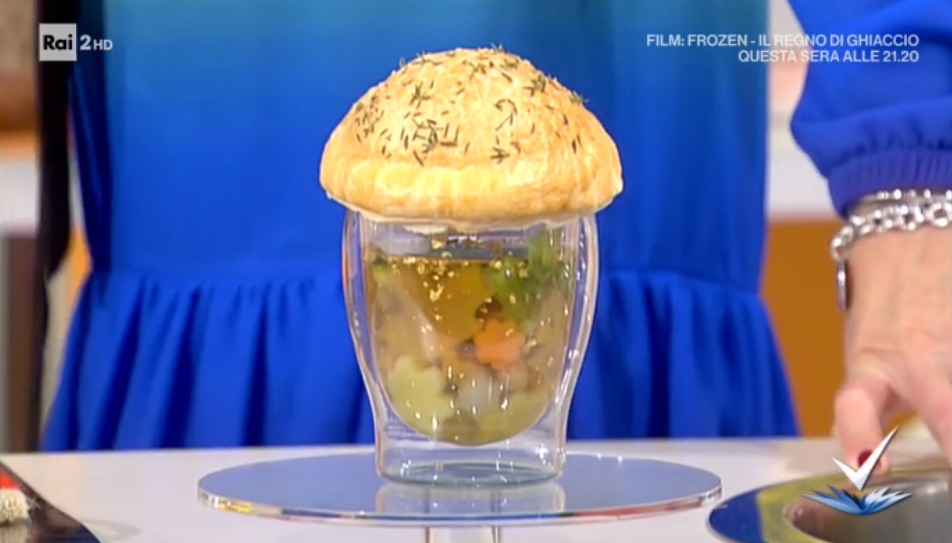 Copriamo la pirofila o pentola con il rotolo di sfoglia, che facciamo ben aderire ai bordi. Ritagliamo l’eccesso ai bordi. Spennelliamo con il tuorlo sbattuto e spolveriamo con del timo fresco. Cuociamo in forno caldo a 180° per 1 ora.