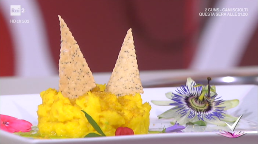 - La mousse (6 persone): 600 g baccalà, 300 g patate, 2 scalogni, 2 foglie di alloro, mezzo bicchiere di vino bianco secco, mezzo bicchiere di olio evo, 2 bustine di zafferano, 50 g bottarga grattugiata, 10 g semi di papavero, sale, granella di pistacchio