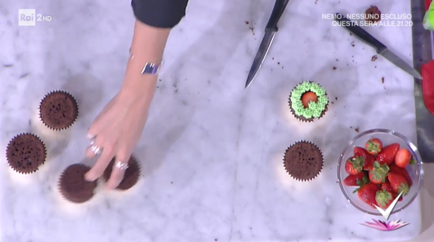 Priviamo i muffin della calotta. Pratichiamo un foro al centro e mettiamo un cucchiaino di crema di nocciole ed una fragola intera.