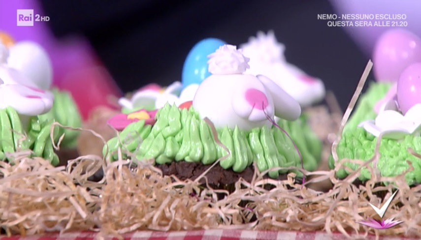 Con la crema al burro ed una sacca da pasticciere formiamo l’erbetta sul muffin. Posizioniamo sopra dei fiorellini e mettiamo in frigorifero. Intanto creiamo un coniglietto con la pasta di zucchero e lo posizioniamo sull’erbetta di crema.