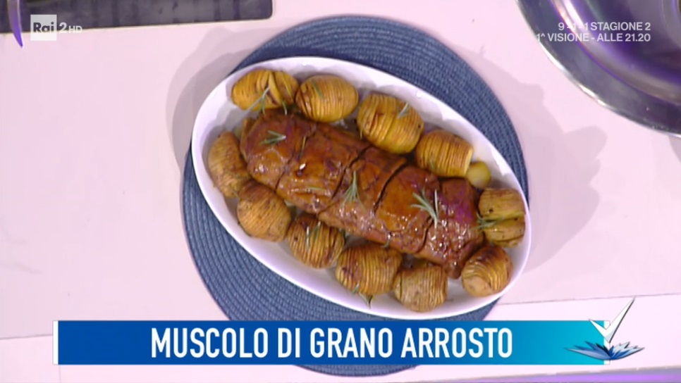 Prendiamo il muscolo di grano (lo trovate online o nei supermercati biologici) e lo posizioniamo all’interno di una pirofila. Lo irroriamo con lo sciroppo d’agave e la salsa di soia e lo rigiriamo più volte, in modo da condirlo uniformemente su tutti i lati. A parte, misceliamo la paprika dolce con la curcuma, il pepe rosa e, a piacere, aglio in polvere e le distribuiamo sul muscolo glassato. Posizioniamo le patate nella stessa pirofila del muscolo, insieme a qualche spicchio d’aglio e rametti di rosmarino. Cuociamo in forno caldo a 170° per 30 minuti: a metà cottura, lo giriamo.