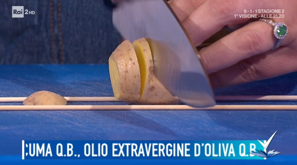 Laviamo le patate con la buccia, quindi le posizioniamo, una per volta, tra due stecchi di legno e le tagliamo a fettine sottili, fino ad arrivare allo spessore degli stecchi: otterremo una sorta di fisarmonica. Le condiamo con abbondante olio, sale e pepe.