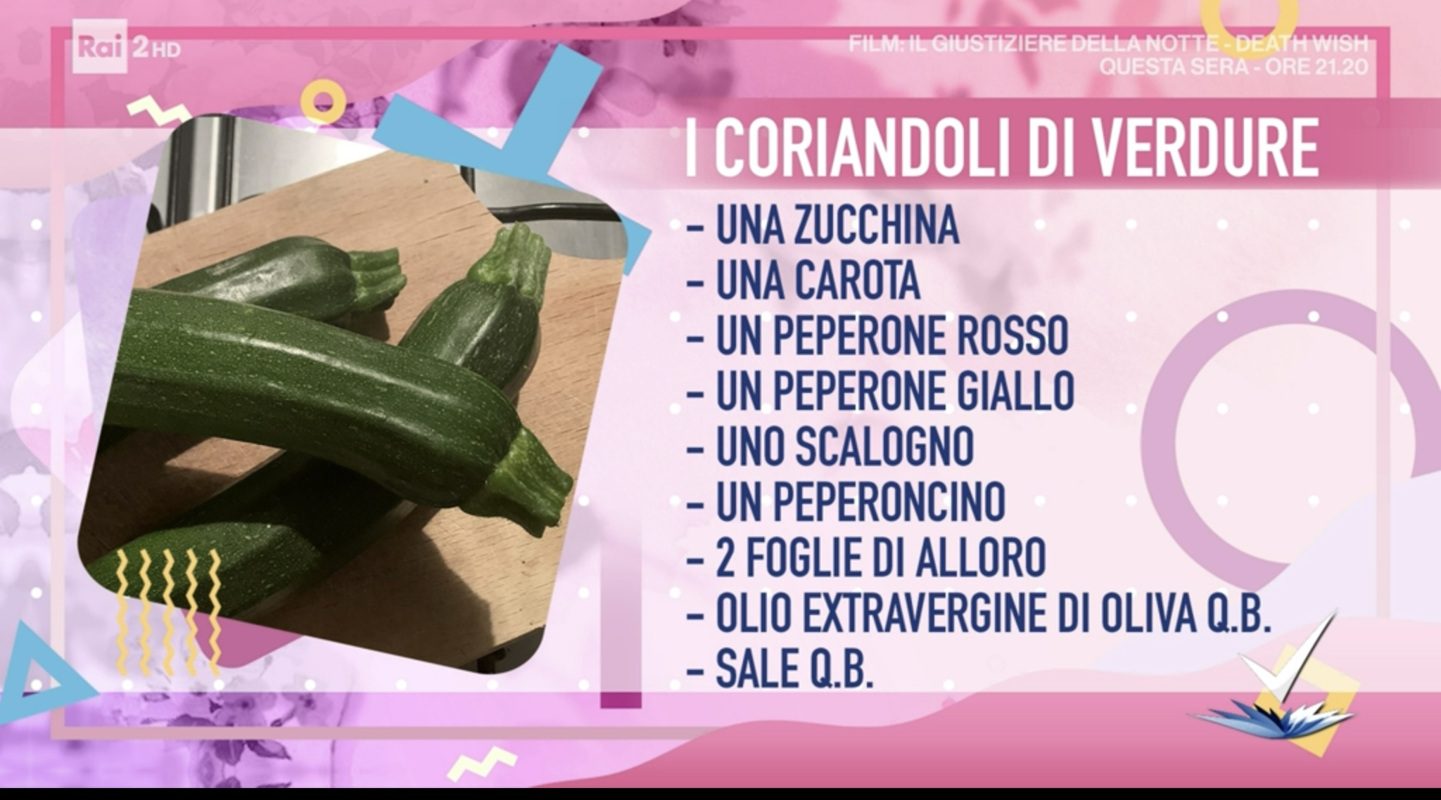 - per le verdure: 1 zucchina, 1 carota, 1 peperone rosso e 1 giallo, 1 scalogno, 1 peperoncino, 2 foglie di alloro, olio extravergine qb, sale qb