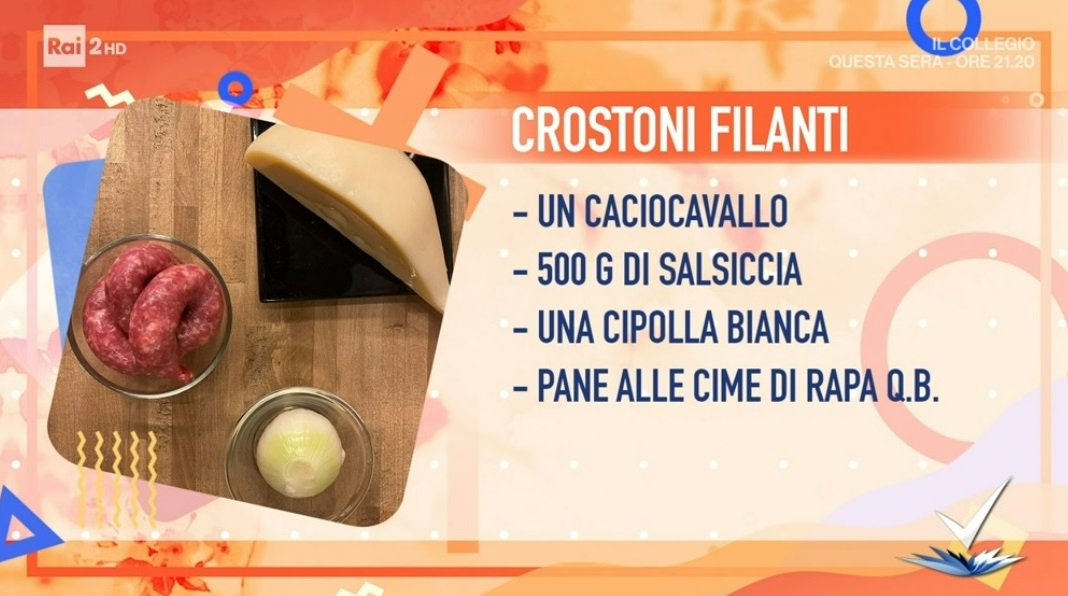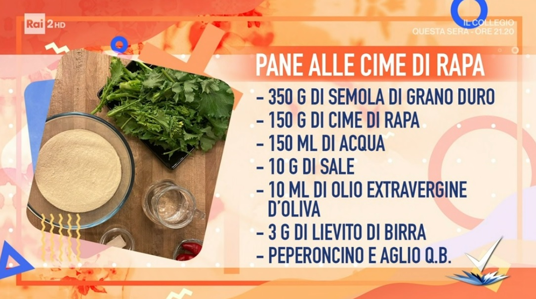 Il tutor Michele Cellammaro, protagonista dello spazio dedicato alla cucina, all’interno del programma condotto da Bianca Guaccero su Rai2, Detto Fatto, ha preparato il pane e crostoni filanti alle cime di rapa. Di seguito ingredienti e procedimento.