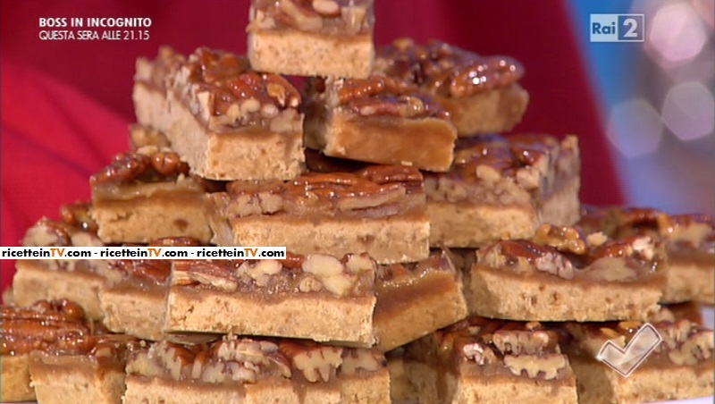 Il tutor Francesco Saccomandi, protagonista dello spazio dedicato alla cucina, all’interno del programma condotto da Caterina Balivo su Rai2, Detto Fatto, ha dato la ricetta delle pecan bars (torta di noci pecan). Di seguito ingredienti e procedimento.