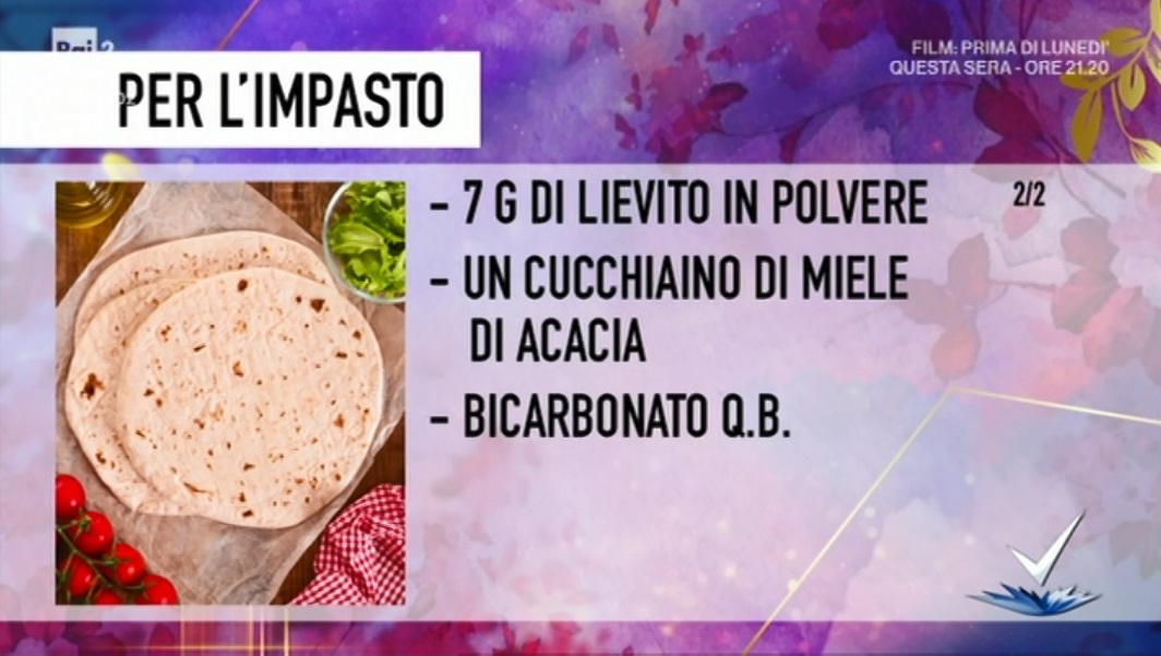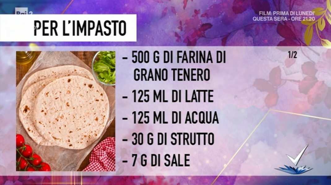Il tutor Simone Finetti, protagonista dello spazio dedicato alla cucina, all’interno del programma condotto da Bianca Guaccero su Rai2, Detto Fatto, ha proposto la piadina classica e quella vegetariana. Di seguito ingredienti e procedimento.