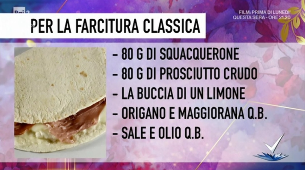 - Farcitura classica: 80 g di squacquerone, 80 g di prosciutto crudo, la buccia di un limone, origano e maggiorana qb, sale e olio qb