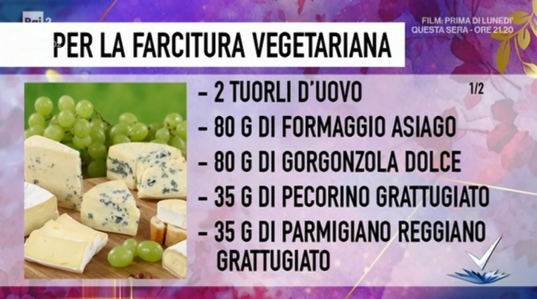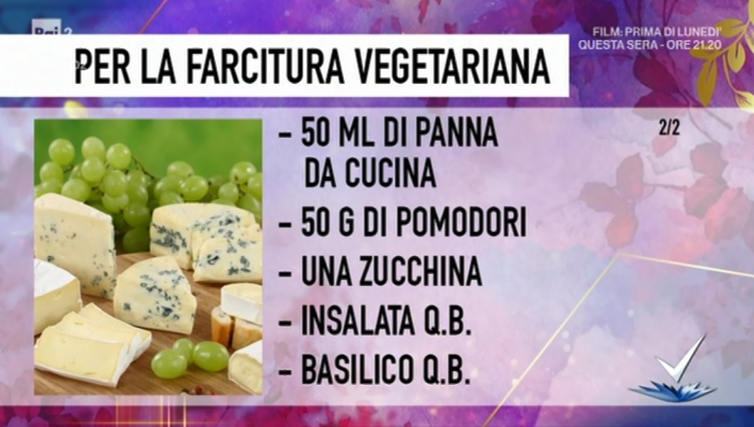 - per la farcitura vegetariana: 50 ml di panna da cucina, 50 g di pomodori, 1 zucchina, insalata iceberg qb, basilico qb, 2 tuorli d’uovo, 80 g di formaggio asiago, 80 g di gorgonzola dolce, 35 g di pecorino grattugiato, 35 g di parmigiano reggiano grattugiato