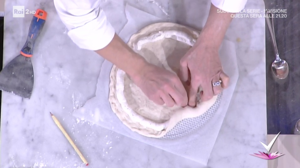 Stendiamo con le mani la pizza su un piano infarinato, assottigliandola soprattutto ai bordi. Appoggiamo su una teglia rotonda e disegniamo il bordo con la ricotta. Avvolgiamo il bordo dell’impasto sulla ricotta, in modo da creare il cornicione ripieno. Condiamo la base della pizza con poco pomodoro: dobbiamo giusto sporcarlo. Inforniamo al massimo della temperatura (240°) per 13 minuti almeno. Una volta cotta, aggiungiamo al centro dell’altra salsa di pomodoro e finiamo con mozzarella, basilico e olive.