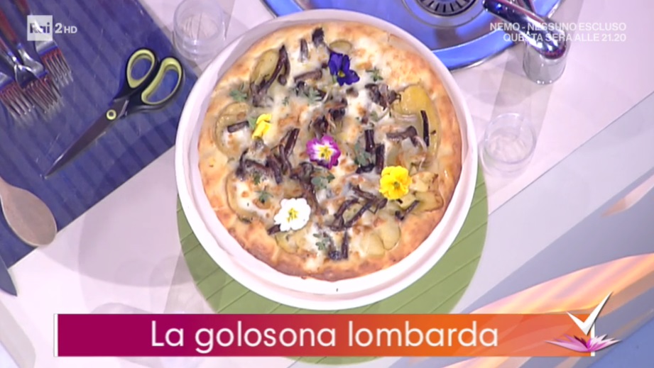 - Condimento: 100 g patate, 100 g funghi chiodini, 100 g mozzarella fior di latte, 100 g taleggio, 1 cipolla rossa, 50 g burro, olio evo, rosmarino, timo, maggiorana, fiori eduli