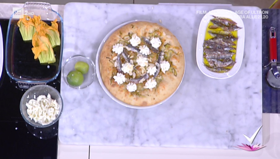 Stendiamo l’impasto lievitato all’interno della stessa teglia dove ha riposato. La copriamo e la lasciamo lievitare ancora un’ora. Disponiamo sulla pizza lievitata i fiori di zucca puliti e aperti. Copriamo con la provola affumicata tritata, un filo d’olio e cuociamo in forno preriscaldato a 220° per 10-15 minuti. All’uscita dal forno, finiamo di condire con le alici dissalate, ciuffi di ricotta e mandorle a lamelle tostate.