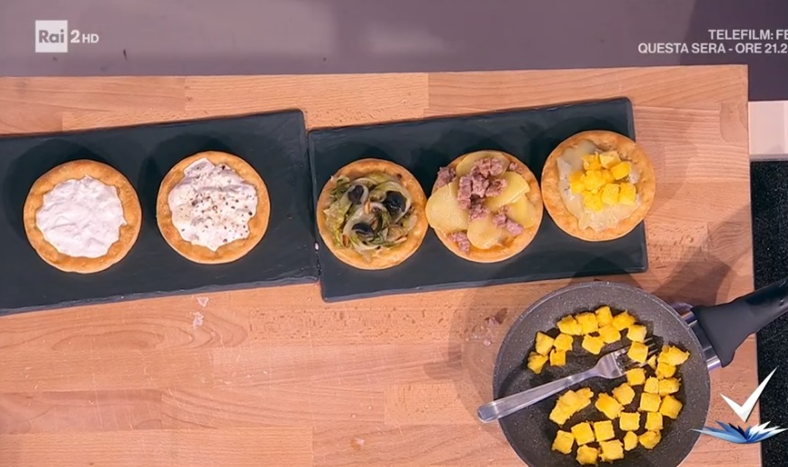 Cuociamo in forno caldo e statico al massimo della temperatura per 10-15 minuti. A questo punto, aggiungiamo alla prima pizzetta la polenta spadellata; alla seconda, il guanciale affettato; sulla quarta, la mortadella affettata ed una spolverata di scorza grattugiata di limone.