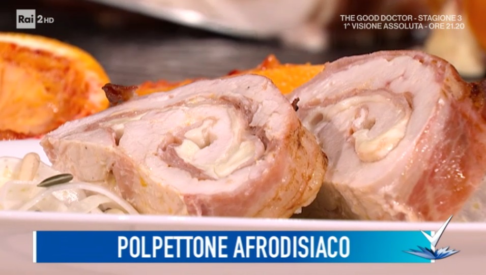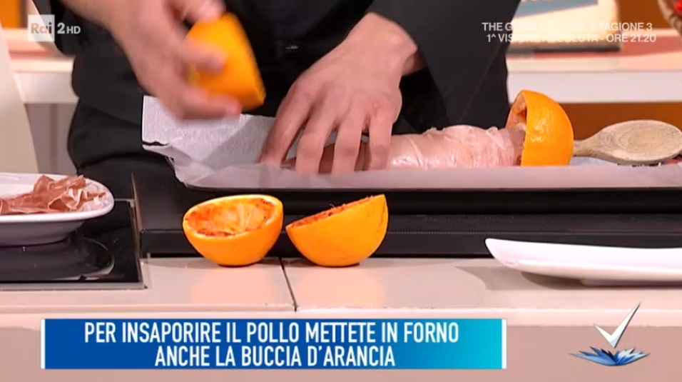 Inseriamo una prima metà dell’arancia nel manico di un cucchiaio di legno. Posizioniamo quest’ultimo sul lato lungo del petto di pollo ed arrotoliamo lo stesso sul manico del cucchiaio, sigillando all’interno il ripieno (foto). Estraiamo il cucchiaio di legno e sigilliamo l’altra metà con l’altro guscio d’arancia rimasto. Foderiamo il rotolo di pollo con la pancetta affettata e cuociamo in forno caldo a 180° per 40 minuti.
