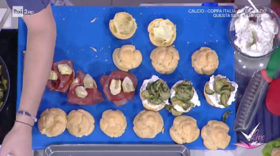 Passiamo alla farcitura. In padella, facciamo soffriggere la cipolla affettata con un filo d’olio. Uniamo le zucchine a fettine. Lasciamo cuocere, senza coprire. Devono dorare. Ci vorranno quasi 40 minuti. Tagliamo a metà i bignè, come fossero panini, e li farciamo con le zucchine e della ricotta fresca condita con olio, sale e pepe. Oppure, con caprino fresco condito con olio, sale e pepe, bresaola e carciofini sott’olio a fettine. Oppure, con gorgonzola morbido, mortadella affettata e pomodorini secchi tagliati a listarelle.