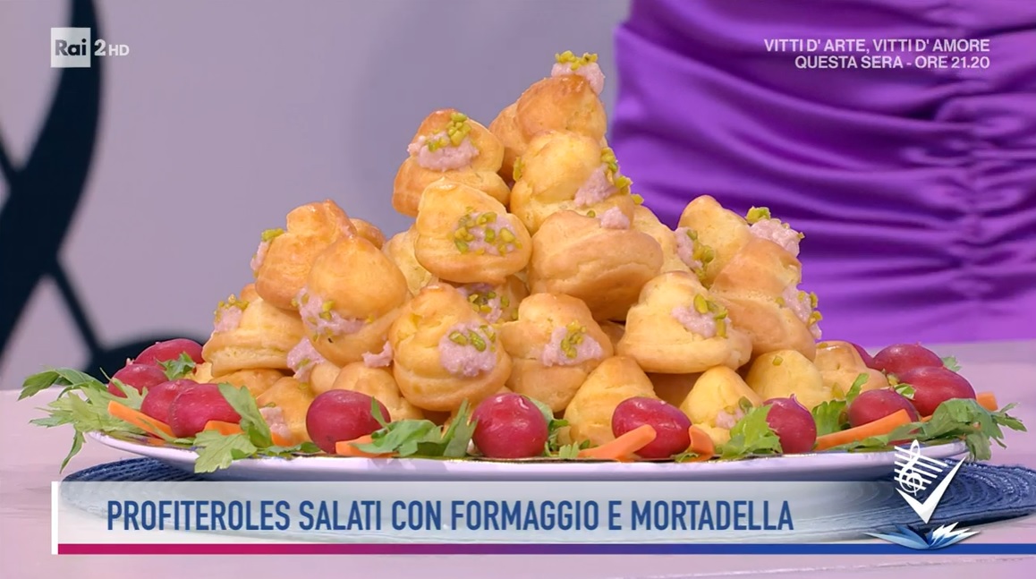 Farciamo i bignè con la crema alla mortadella. Decoriamo con la granella di pistacchi.