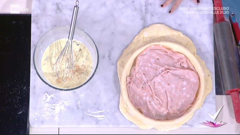 Lasciamo lievitare l’impasto, coperto da pellicola, per 2 ore circa a temperatura ambiente. Lo allarghiamo delicatamente su un ripiano infarinato. Stendiamo con un mattarello all’altezza di circa mezzo cm. Inseriamo all’interno di una teglia rotonda ben unta d’olio.