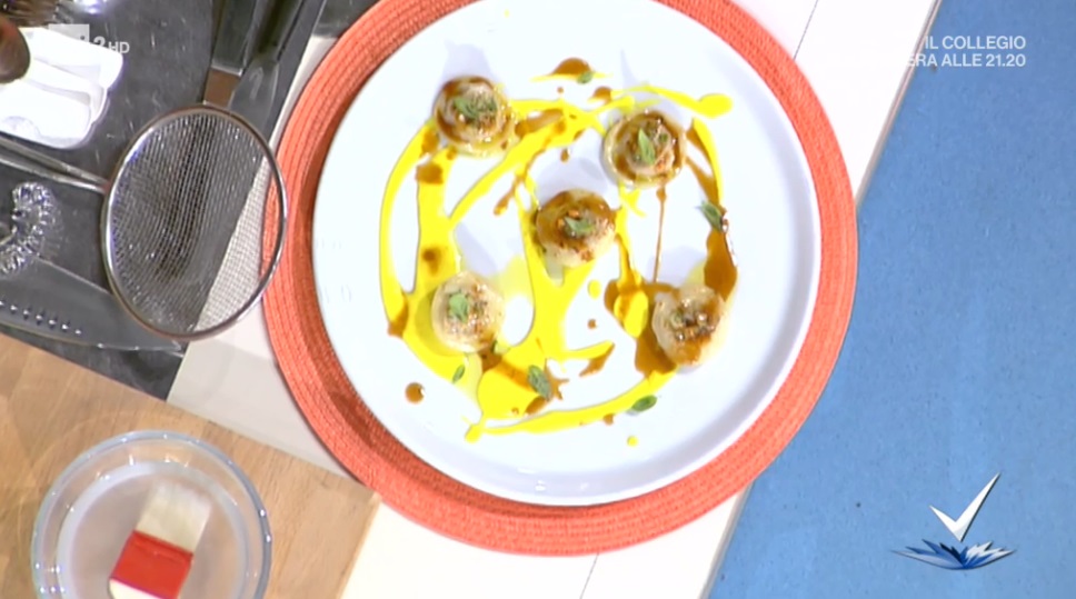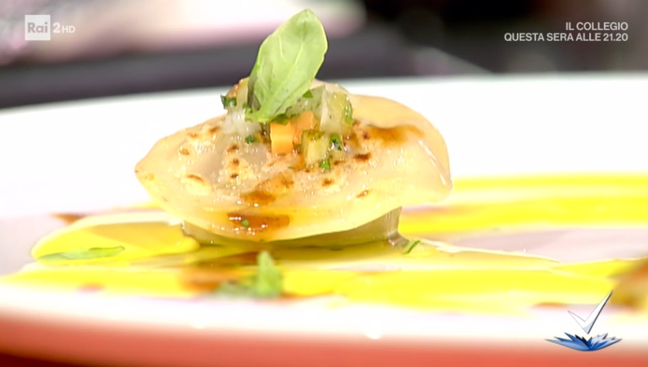 Disponiamo sulla sfoglia di pasta delle noci di ripieno. Copriamo con un’altra sfoglia di pasta e sigilliamo i ravioli, che ritagliamo con un coppapasta. Li cuociamo in acqua bollente e salata. Li scoliamo, li condiamo con dell’olio e li posizioniamo su una padella ben calda: lasciamo che dorino alla base.