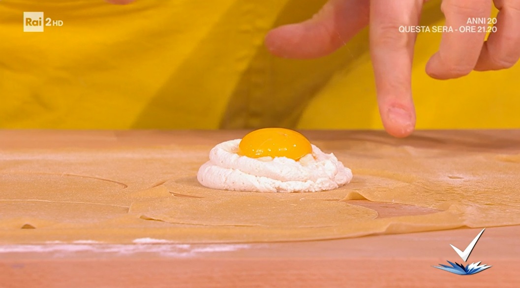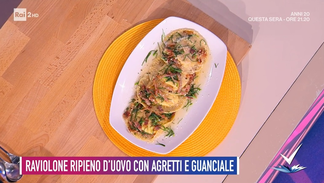 Il tutor Beniamino Baleotti, protagonista dello spazio dedicato alla cucina, all’interno del programma condotto da Bianca Guaccero su Rai2, Detto Fatto, ha preparato il raviolone ripieno d’uovo con agretti e guanciale. Di seguito ingredienti e procedimento.