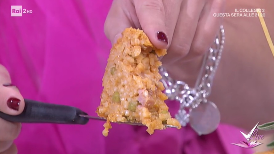 - 350 g riso, 200 g carne macinata, 100 g prosciutto cotto, 100 g mozzarella, 80 g piselli, 2 l salsa di pomodoro, 1 cipolla, 1 bicchiere di vino bianco, sale, pepe, formaggio grattugiato, pane grattugiato, olio evo
