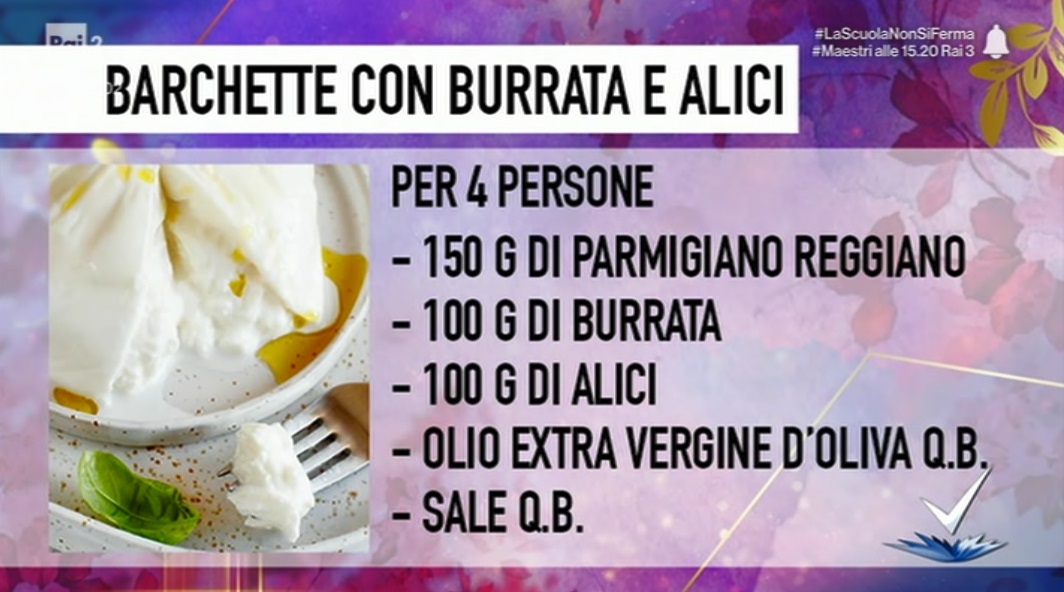 - per le barchette: 150 g di parmigiano reggiano, 100 g di burrata, 100 g di alici, olio extravergine di oliva qb, sale qb