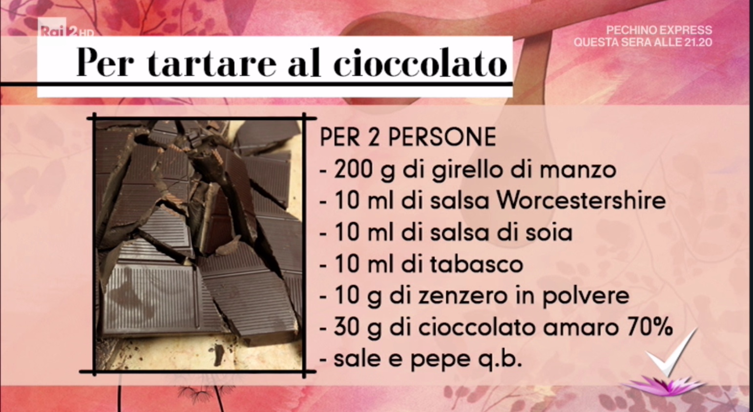Il tutor Luca Terni, protagonista dello spazio dedicato alla cucina, all’interno del programma condotto da Bianca Guaccero su Rai2, Detto Fatto, ha dato la ricetta della tartare, realizzandoa in tre modi: classica, al cioccolato e alla nocciola. Di seguito ingredienti e procedimento.