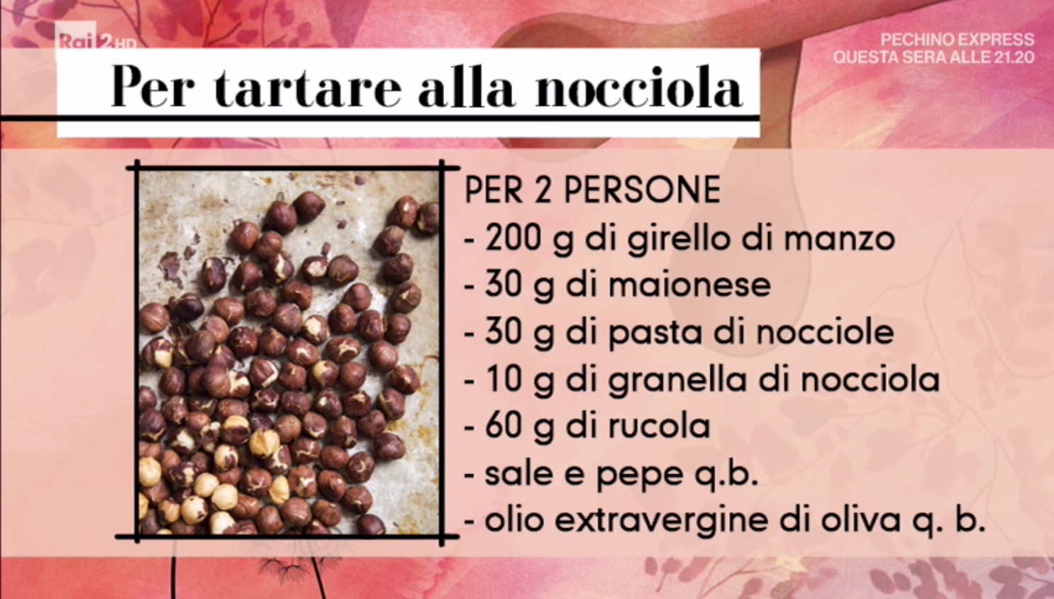 • alla nocciola: 200 g di girello di manzo, 30 g di maionese, 30 g di pasta di nocciole, 10 g di granella di nocciole, 60 g di rucola, olio, sale e pepe