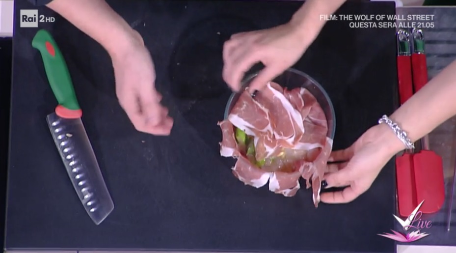 Prendiamo uno stampo a forma di cupola, che può andare in forno, e lo foderiamo con il prosciutto crudo affettato sottile, facendo uscire dai bordi parte delle fette. Versiamo all’interno il composto di pollo e albumi. Copriamo con il prosciutto precedentemente appoggiato sui bordi. Inforniamo a 160°, forno preriscaldato e statico, per 45 minuti circa.