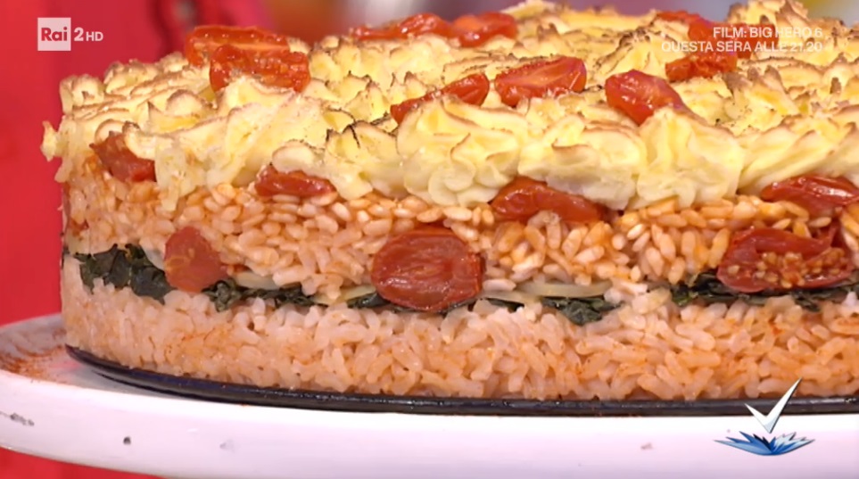 Formiamo un primo strato di riso alla base di una tortiera a cerniera. Adagiamo sopra la parte verde del cavolo nero (cruda) tritata grossolanamente; proseguiamo con le patate crude tagliate a fettine sottilissime. Copriamo con il riso rimasto e livelliamo. Cuociamo in forno caldo e statico a 180° per 10 minuti.