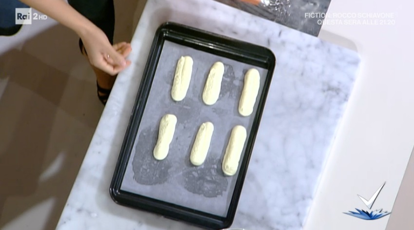 Savoiardi: montiamo i tuorli con parte dello zucchero per lungo tempo, fino ad ottenere un composto chiaro e spumoso. A parte, montiamo gli albumi a neve insieme allo zucchero rimasto. Incorporiamo gli albumi ai tuorli, mescolando delicatamente. Aggiungiamo, pian piano, farina e fecola setacciati insieme. Infine, incorporiamo il lievito per dolci setacciato. Trasferiamo in una sacca da pasticcere, quindi formiamo su una teglia con carta forno dei bastoncini lunghi circa 10 cm. Spolveriamo con lo zucchero a velo e cuociamo in forno preriscaldato e statico a 170° per 22 minuti circa.