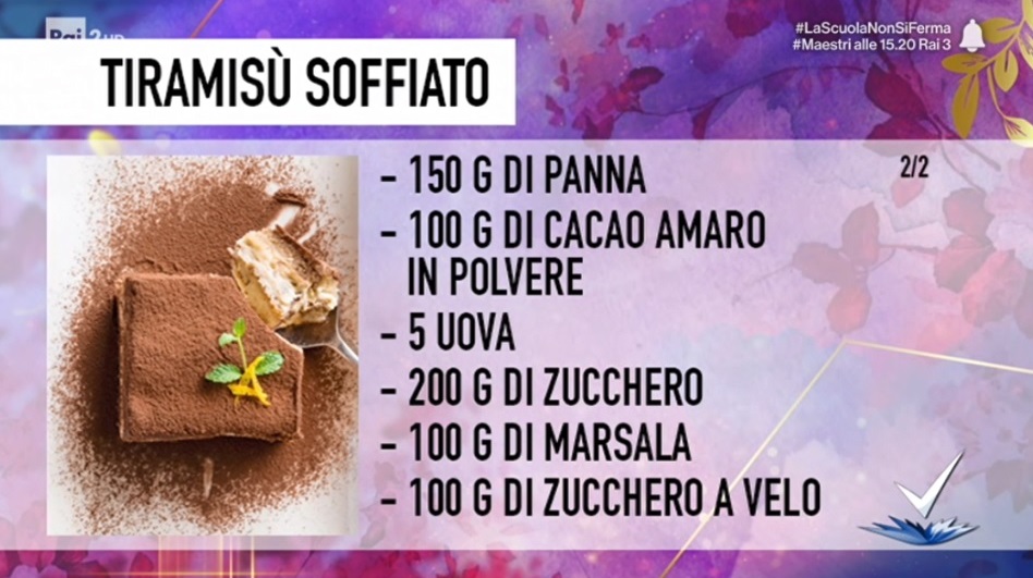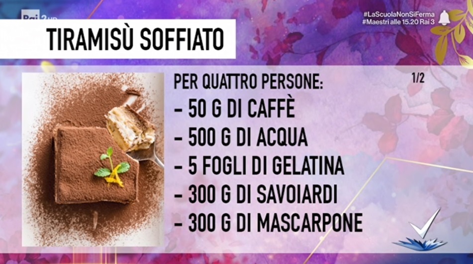 Il tutor Matteo Torretta, protagonista dello spazio dedicato alla cucina, all’interno del programma condotto da Bianca Guaccero su Rai2, Detto Fatto, ha dato la ricetta del tiramisù soffiato. Di seguito ingredienti e procedimento.
