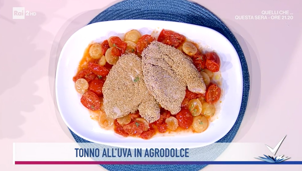 Serviamo il tonno con il contorno di uva e pomodorini.