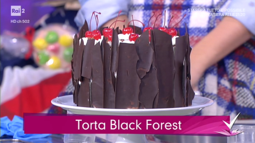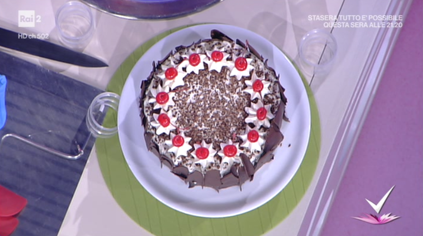 Alterniamo strati di pan di Spagna (bagnati con lo sciroppo alle amarene) a strati di crema e amarene sciroppate. Glassiamo l’intera torta con la crema rimasta. Decoriamo i bordi con le scaglie di cioccolato fondente e decoriamo a piacere.